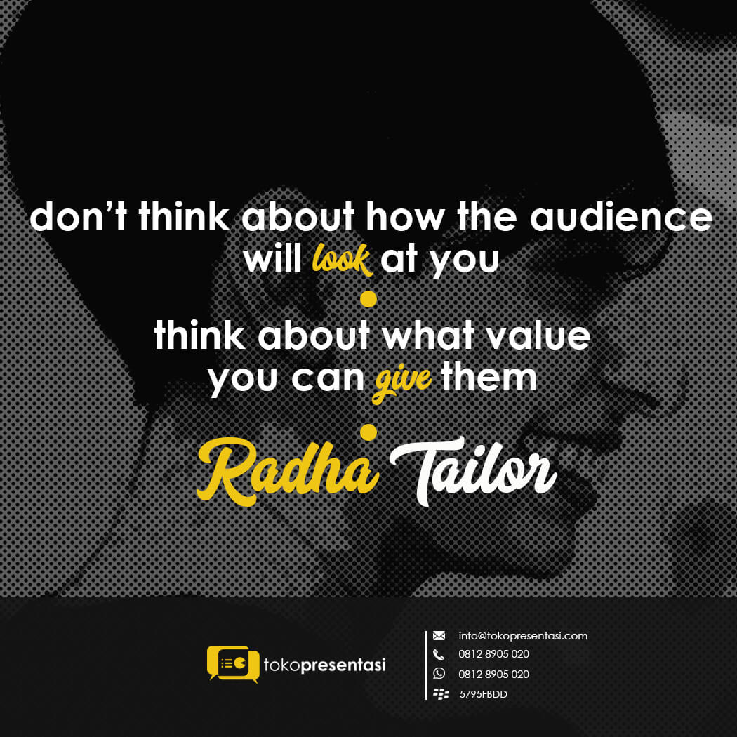 Untuk itu, jangan berpikir bagaimana audiens melihat Anda didepan, namun pikirkan lah apa yang akan mereka dapat, apa nilai dan pesan yang akan mereka dapat dan manfaat yang mereka terima ketika mendengarkan Anda.